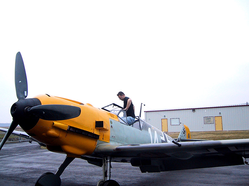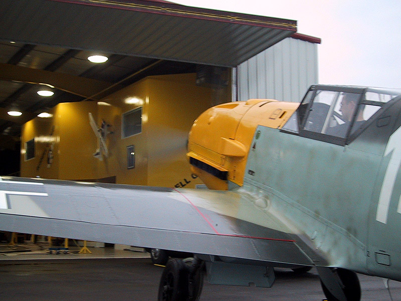 After we left there, Denis and I drove about 40 km south to Ed Russell’s facility to see if we could have a look at his aircraft collection. In this collection is a very special aircraft in the form of Messerschmitt Bf 109E-7 WNr 3579, an aircraft flown by FΓ€hnrich Hans Joachim Marseille with I.(J)/LG2 during the Battle of Britain. Well, not only did they allow us to visit, we happened to arrive just as Andrej and Mike were about to wheel out the Emil to do a max static RPM test on the engine (they had just rehung the prop a couple days previous). Note: For those near the area, they plan to do the first test flight in mid-May, preparing for their airshow June 3-6, 2005.