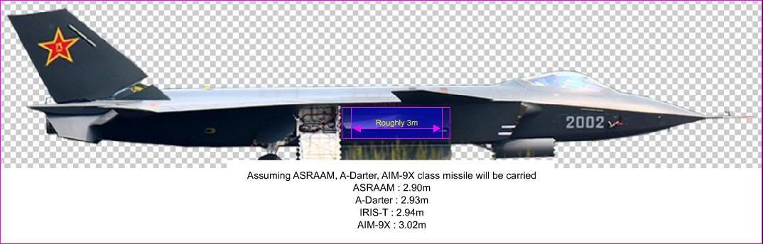 We don’t know what missile is going to be carried by the J-20 side bays and how. PL-8B is 2.95m, PL-9C is 2.9m and both have large control surfaces. AIM-9L/M is 2.85m. If the J-20 is going to carry PL-8B in its side bay, then you are right, the plane will be large, unusually large for a fighter. But, until they start loading the the missiles, we will have to weight.